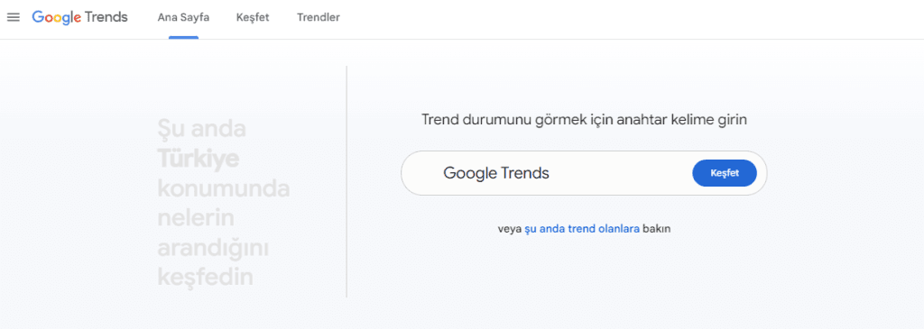Arama trendleri için Google Trends’e girdikten sonra “Trendler” seçeneğini kullanmalısınız: